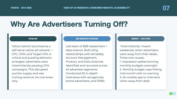 Built UX Research practice, combined with Consumer Insights and Accessibility practices to have deep impact on products, brands and corporate strategies for all of Yahoo!, Aol, Huffington Post, and more